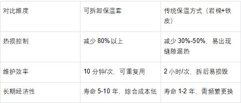 從數(shù)據(jù)可見,可拆卸保溫套不僅能解決傳統(tǒng)保溫的“熱損高、維護(hù)難”痛點(diǎn),更能通過長(zhǎng)期耐用性降低綜合成本,投資回報(bào)周期普遍不超過8個(gè)月,之后每年都能為企業(yè)帶來(lái)穩(wěn)定的節(jié)能收益。